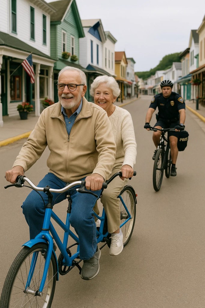 Mackinac Island, MI – A pair of elderly tourists riding a tandem bicycle led a Mackinac Island police officer on a slow-moving pursuit Saturday afternoon after failing to yield to a horse-drawn carriage on the city’s main street, authorities said.