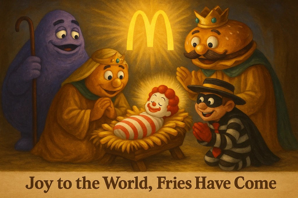 Chicago, IL – McDonald’s has found itself at the center of a holiday controversy after releasing a Christmas card that reimagines the Nativity scene with its iconic mascots. The image shows Ronald McDonald as the baby Jesus lying in a manger made of golden fries, surrounded by a fast-food retinue of familiar faces. Grimace appears as a shepherd, the Hamburglar kneels by the manger with his trademark grin, and Mayor McCheese watches over the baby like a curious monarch. Above them, a soft golden light radiates from a glowing McDonald’s “M,” standing in for the star of Bethlehem. The tagline printed beneath the scene reads, “Joy to the World, Fries Have Come.”
